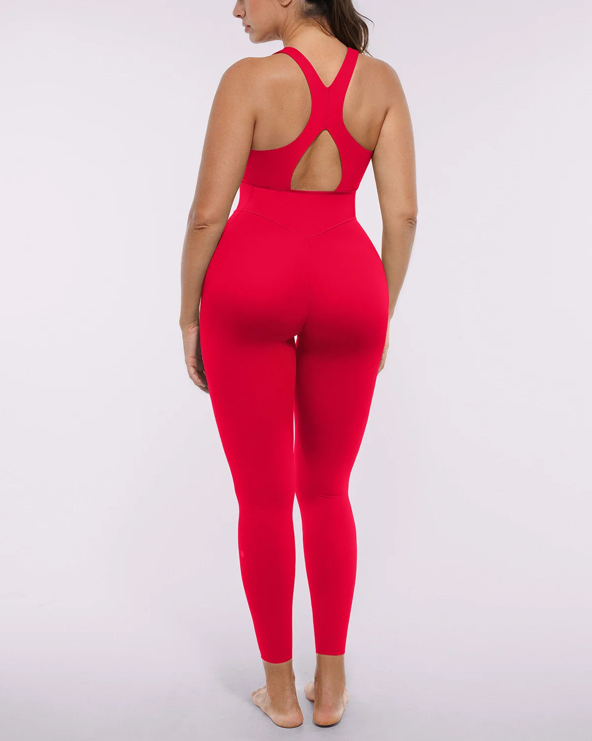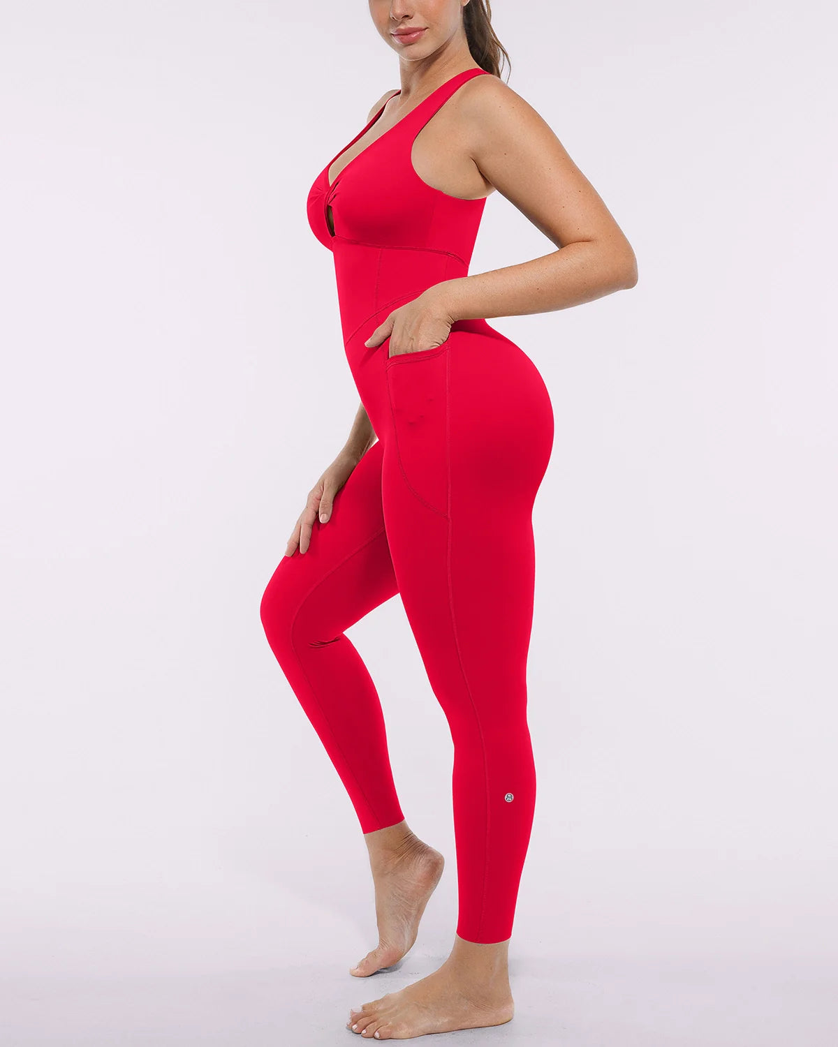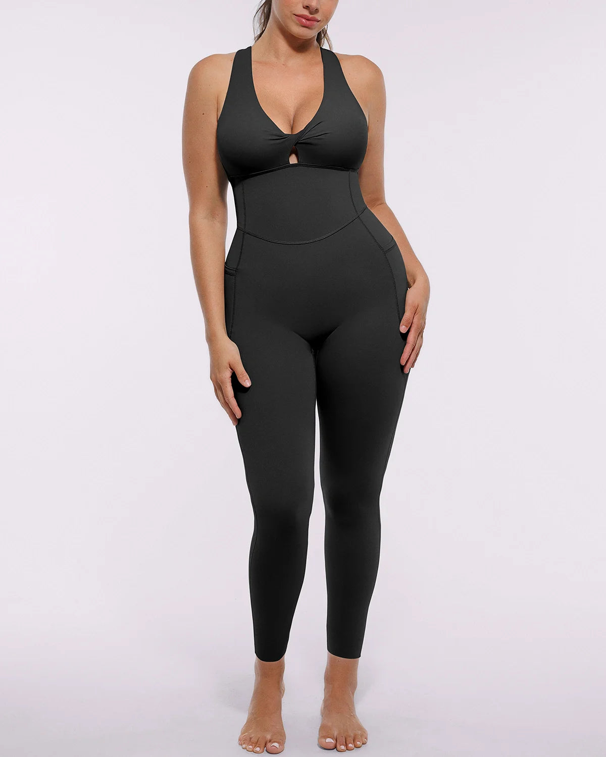 NeoSweat® AirSlim® Racerback Jumpsuit - a sleek, sculpting one-piece that flatters and performs. The stylish V-neck and racerback highlight your curves, while hidden pockets and removable cups add practical versatility. With adjustable hems and seamless comfort, it's perfect for workouts or weekend wear.