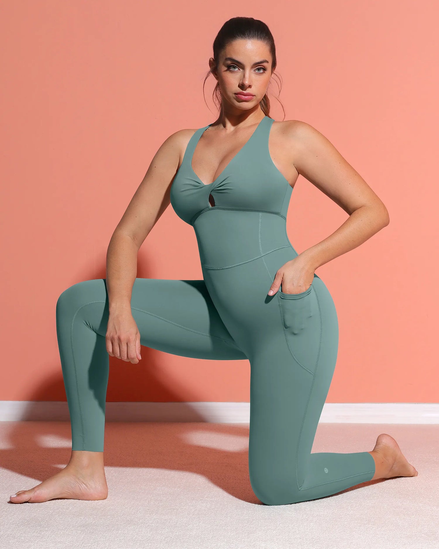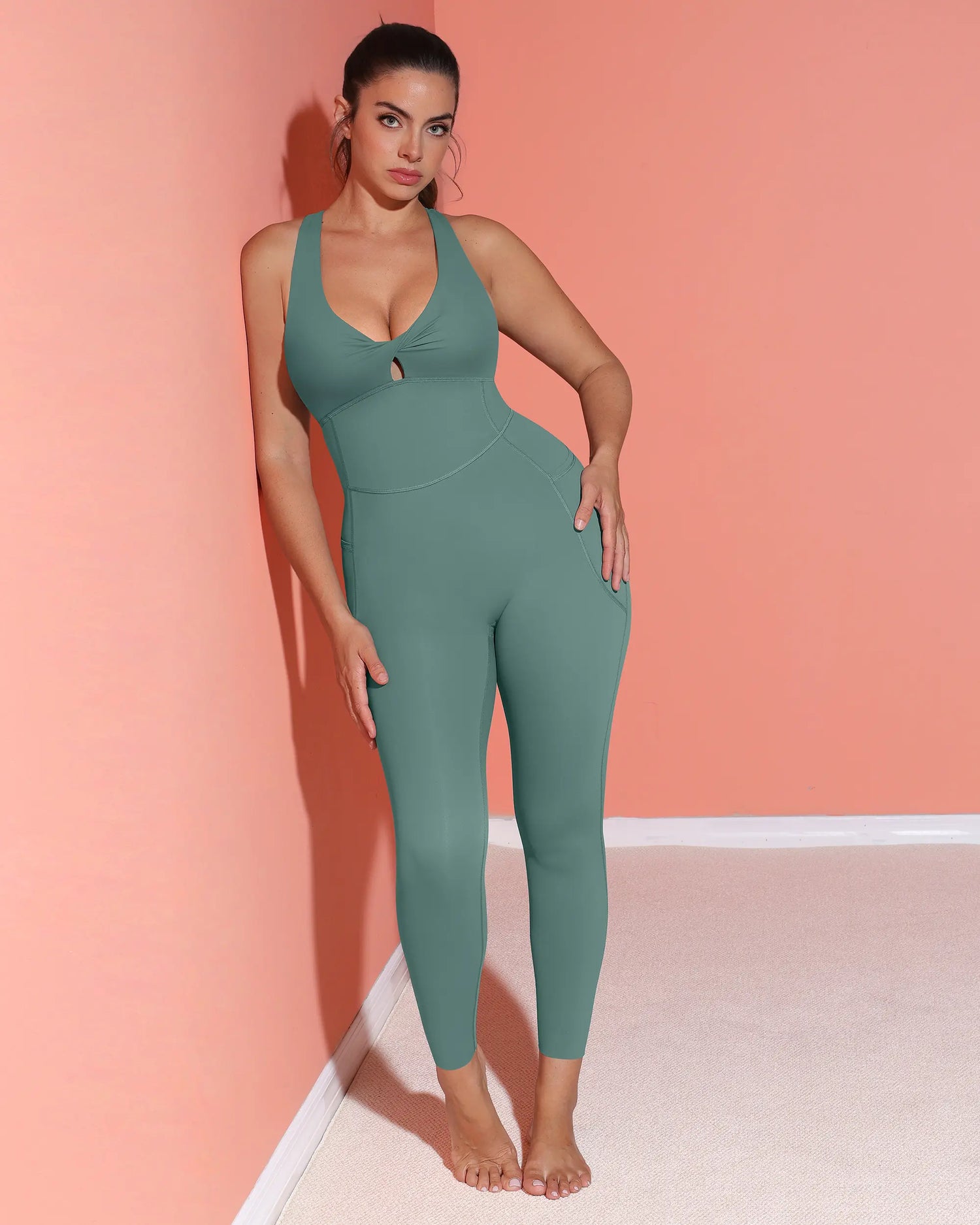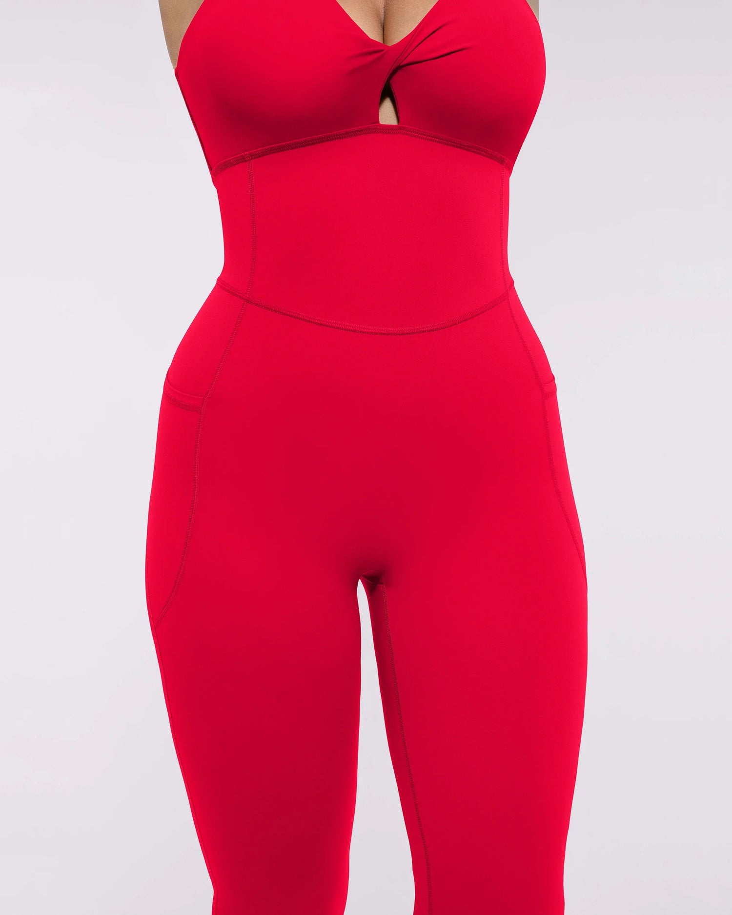 NeoSweat® AirSlim® Racerback Jumpsuit - a sleek, sculpting one-piece that flatters and performs. The stylish V-neck and racerback highlight your curves, while hidden pockets and removable cups add practical versatility. With adjustable hems and seamless comfort, it's perfect for workouts or weekend wear.
